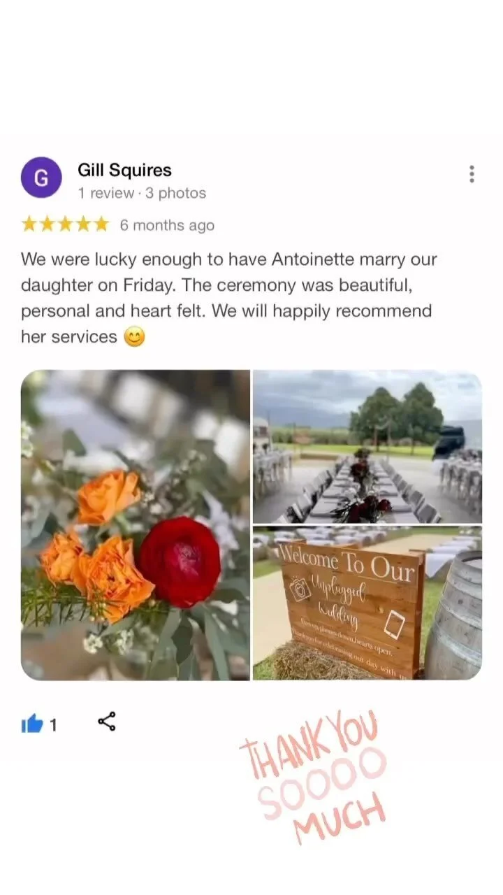 “Antoinette was such a flexible, organised and approachable celebrant! She took on our quirky requests, adapted things at very last minute and made sure our ceremony was faultless. We are SO grateful to have had Antoinette marry us - we can't thank you enough” ~ Brooke Longham “Our wedding was in Brisbane, but we live in New Zealand. Antoinette knew what was required for overseas residents wanting to get married in Australia which made organizing this so easy. All the legal bits and paperwork we did at home in Auckland. Antoinette came to visit the day after we arrived in Brisbane to run through how the ceremony would go, we also got to met her Roadie, Dai her husband. The following day was our backyard wedding and it was perfect! Thank you Toni for helping us with our perfect backyard wedding.” ~ Kelly Allen “Antoinette went above and beyond to help make our special day run smoothly. She was organised from the beginning and listened to everything we asked and made it happen! I can’t recommend her highly enough, she was such a huge part of making our wedding so unforgettable and perfect.”Bridgette McIlwain “Antoinette was the celebrant at a wedding we attended, the ceremony was beautiful and very professional. Highly recommended for your special day!” ~ Natalie Hector “We were lucky enough to have Antoinette marry our daughter on Friday. The ceremony was beautiful, personal and heartfelt. We will happily recommend her services.” ~ Gill Squires “Antoinette was an amazing celebrant. The ceremony was unique and enjoyable. I wouldn’t hesitate to recommend her!” ~ Lucy Boland My good friend Kelly flew over from New Zealand on Easter weekend to marry her long time partner Ed. Antoinette was extremely organised, professional and gave a beautiful ceremony that everyone enjoyed. She put the bride and groom at ease with her knowledge of the rules and legalities of getting married overseas. Nothing was too much trouble and it was nice to see Antoinette get recognition in their speeches. ~ Angelique Monk 〰️